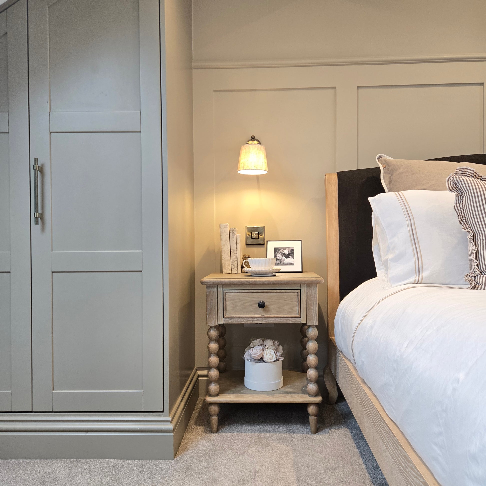 Featuring intricate hand-turned bobbin detailing, this bedside table brings classic charm and character to your bedroom. Designed with one spacious drawer, it provides convenient storage for night time essentials, while its compact design ensures versatility in both small and large spaces.
