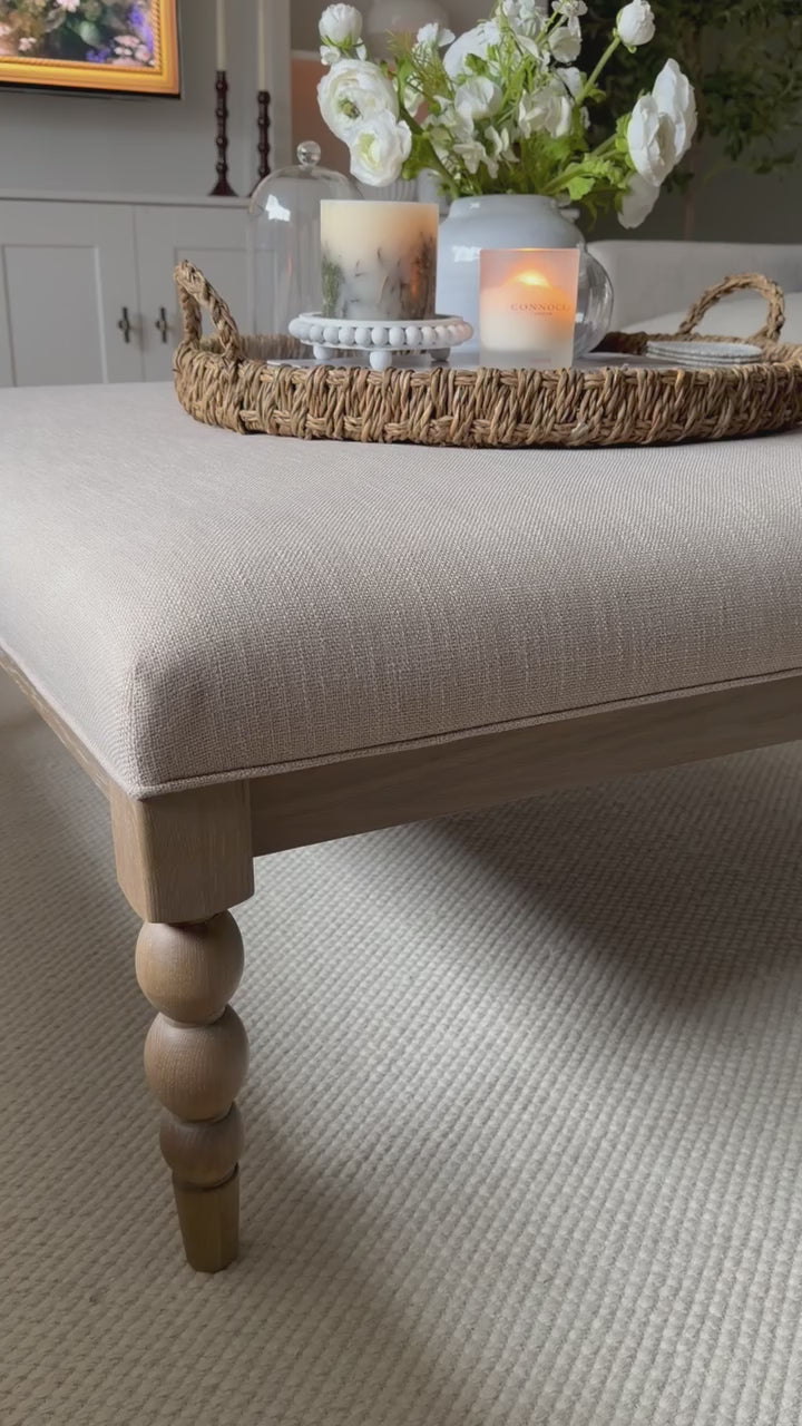 Elevate your living room with the timeless elegance of the Beaumont Coffee Table. Expertly crafted from solid oak, this piece showcases hand-turned bobbin legs, a traditional technique perfected by skilled artisans using a wood lathe. The subtle lime-wash finish enhances the natural oak grain, creating a soft, mellow tone that blends beautifully into both modern and classic interiors.
